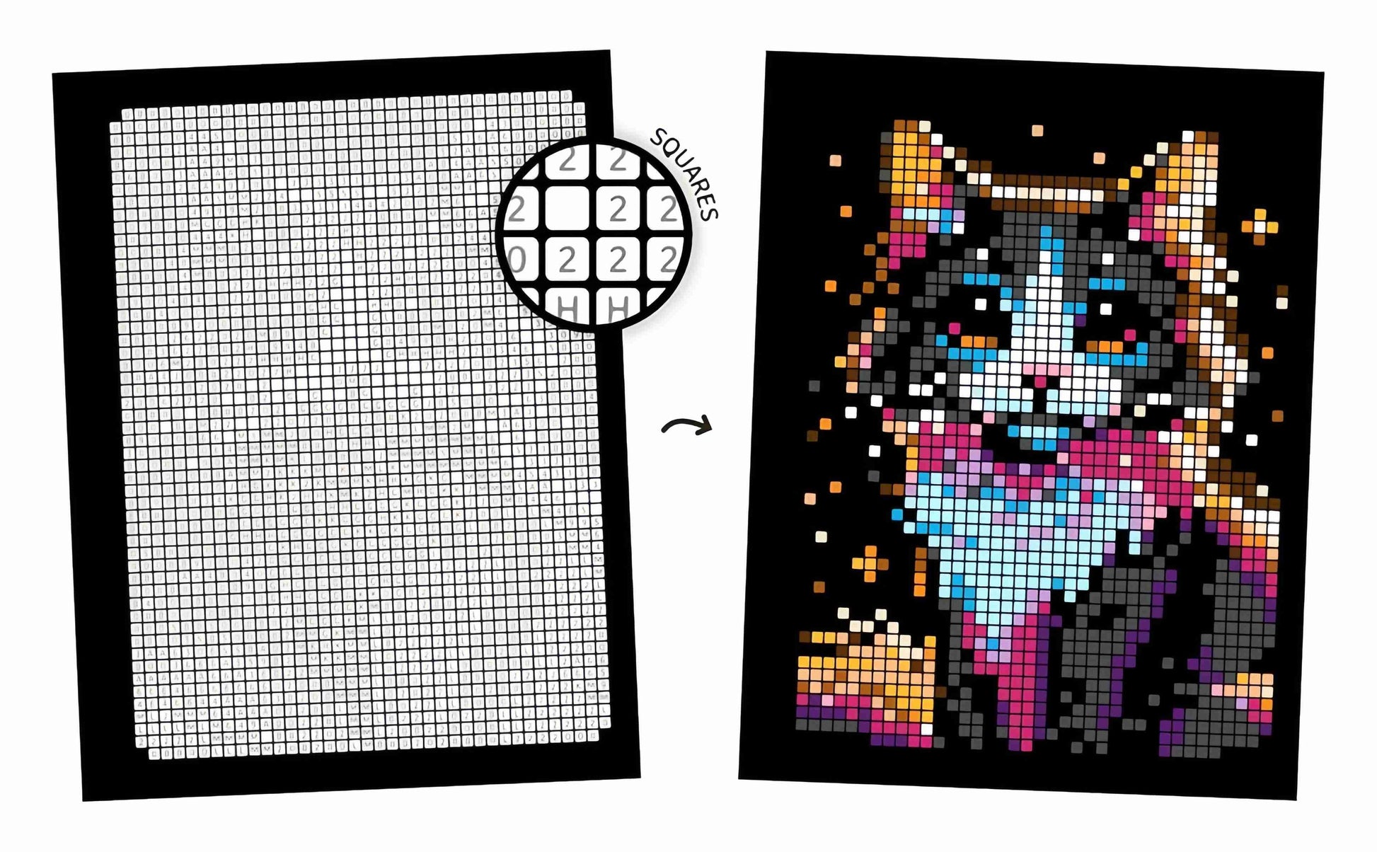 This book features bold grid lines on a black background, making it easy to see each section clearly and color with confidence.